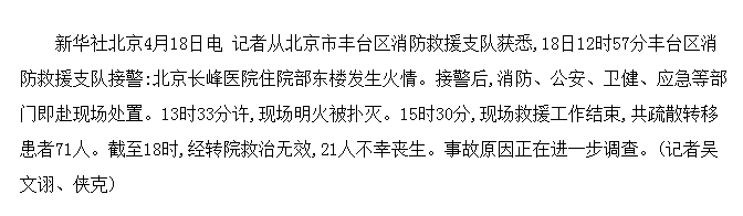 據(jù)新華社消息,北京長峰醫(yī)院住院部東樓發(fā)生火情。接警后,消防、公安、衛(wèi)健、應急等部門即赴現(xiàn)場處置,71位患者被轉(zhuǎn)移疏散,但仍有21人經(jīng)轉(zhuǎn)移救治無效,不幸喪生。事故原因正在進一步調(diào)查。